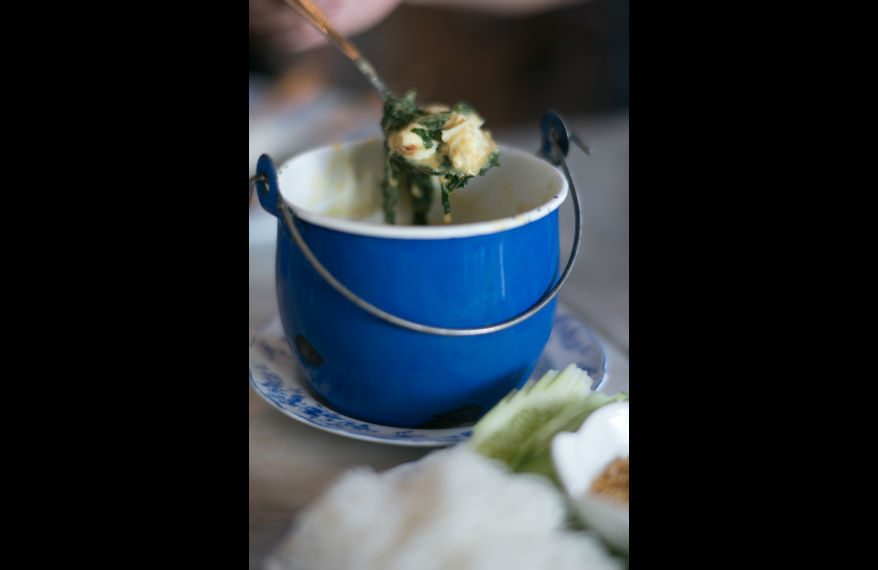 Highlights of Tu Kab Khao include the immaculately slow-cooked moo hong (a Phuket-style stewed pork), nam prik (spicy shrimp paste dipping sauce with boiled shrimp), stir-fried melinjo with glass noodles and dried shrimp, gaeng poo (crab curry with chapoo leaves served with rice noodles), and stir-fried lotus stem with mackerel.